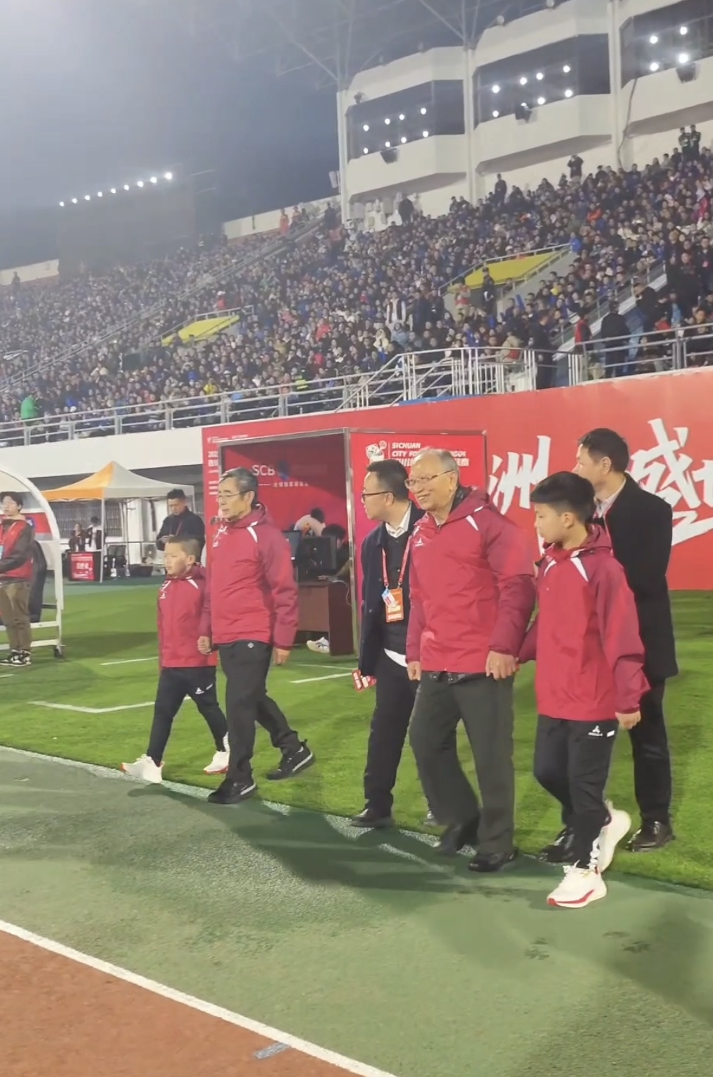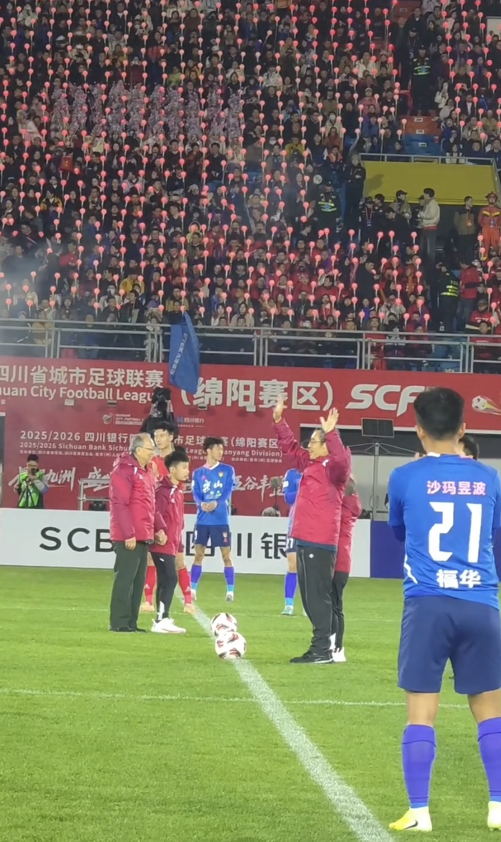 3月14日晚,在四川绵阳南河体育中心绿茵场上,两院院士为川超总决赛绵阳揭幕战开球。